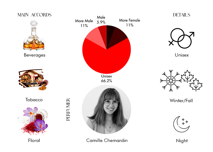 - Guitar Wood Liqueur, Amaretto Accord, Roasted Sesame, Vanilla Tobacco, Pink Pepper, Benzoin and Saffron