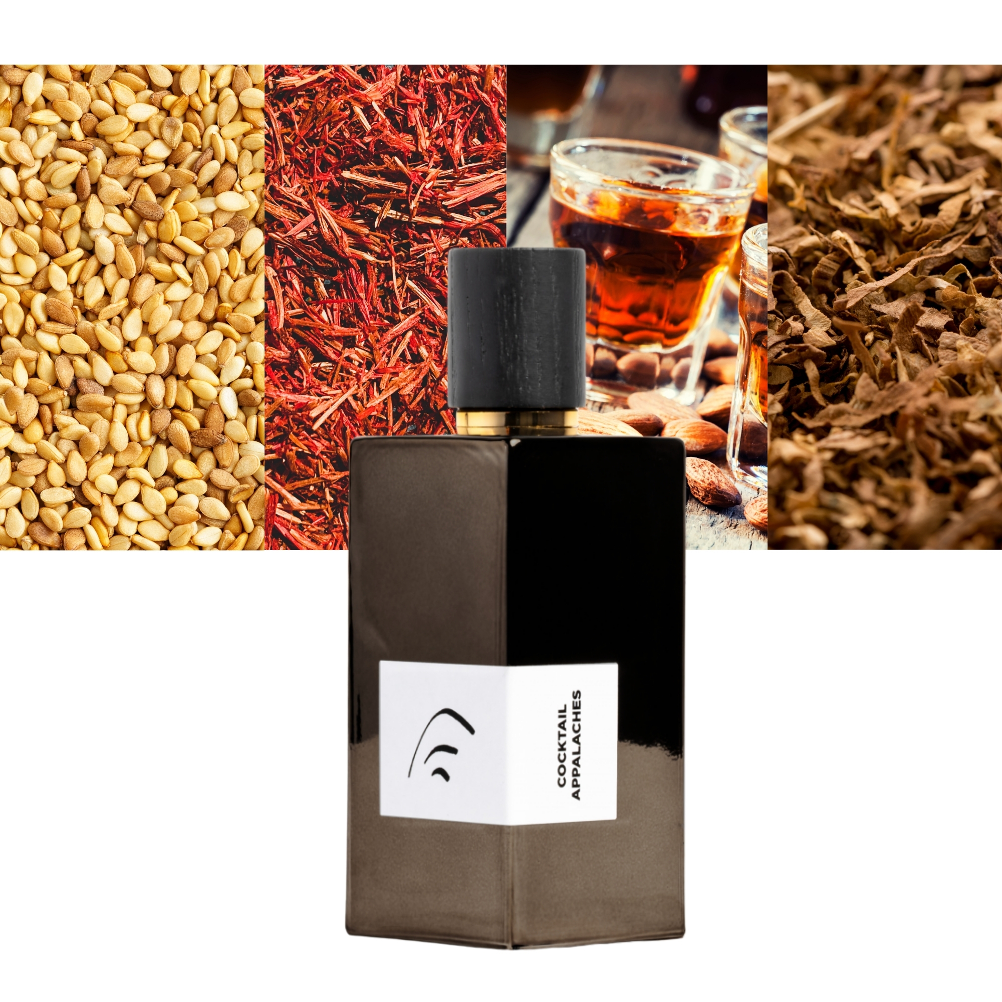 Cocktail Appalaches is a rich and complex fragrance blending warm, woody, and spicy notes. Guitar wood liqueur, roasted sesame, and vanilla tobacco create a cozy base, while amaretto accord adds sweetness and pink pepper delivers a zesty kick. Benzoin and saffron add depth and warmth, resulting in a luxurious, multifaceted scent.