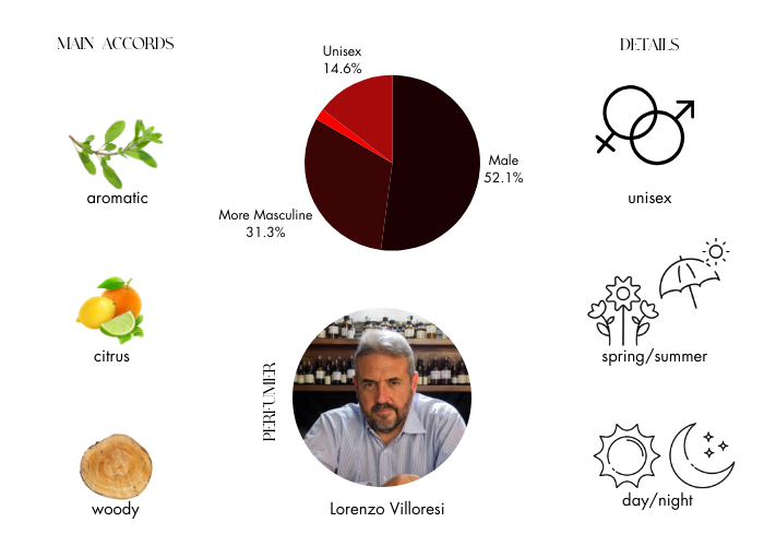 Citrus and green Fragrance, Notes are Peppers ,Tuscan spices, Santal , Oakmoss, Patchouli ,Vetiver Bourbon,resins, roots, vegetable mousses ,and Asian balsams.Made in Italy .
