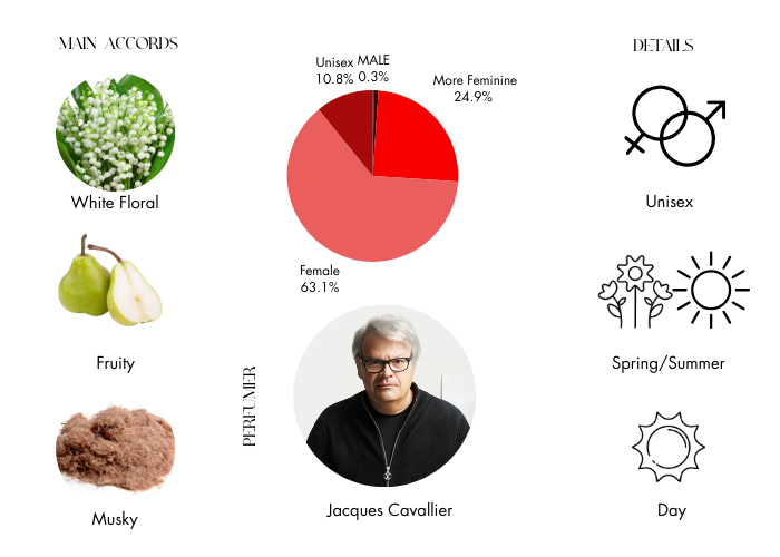 - Middle Notes: Lily of the Valley, Damask Rose Absolute and Jasminum Grandiflorum Absolute