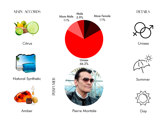 - Middle Notes: Iodine, Tiare, Mimosa, Spindrift, Pine and Vetiver