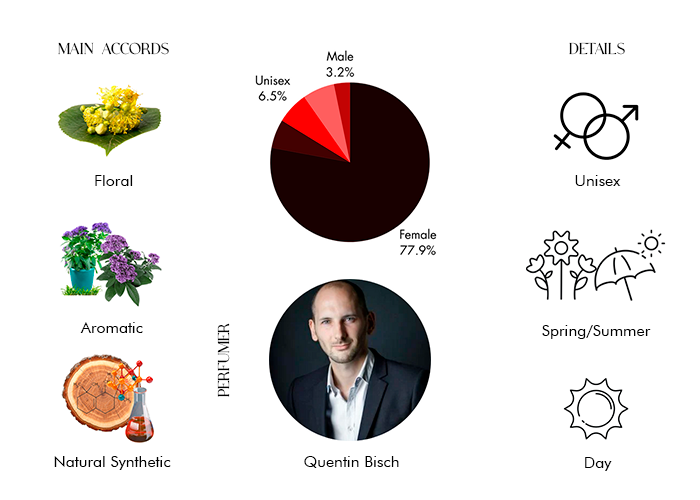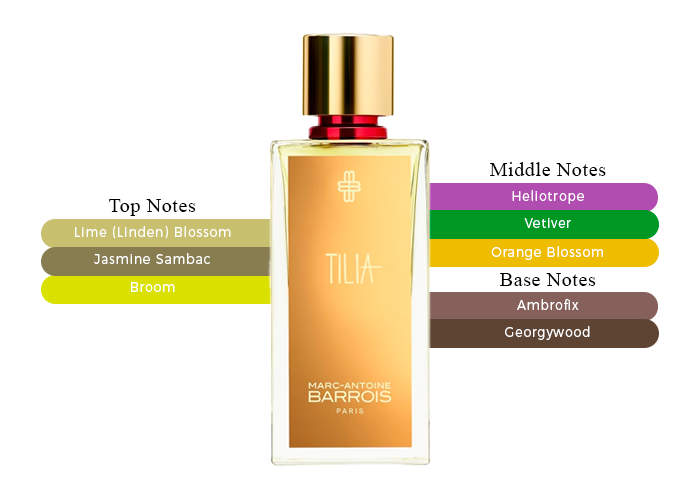- Sambac, Linden, Broom, Jasmine, Vetiver, Heliotrope, Woody Accord and Ambroxan
