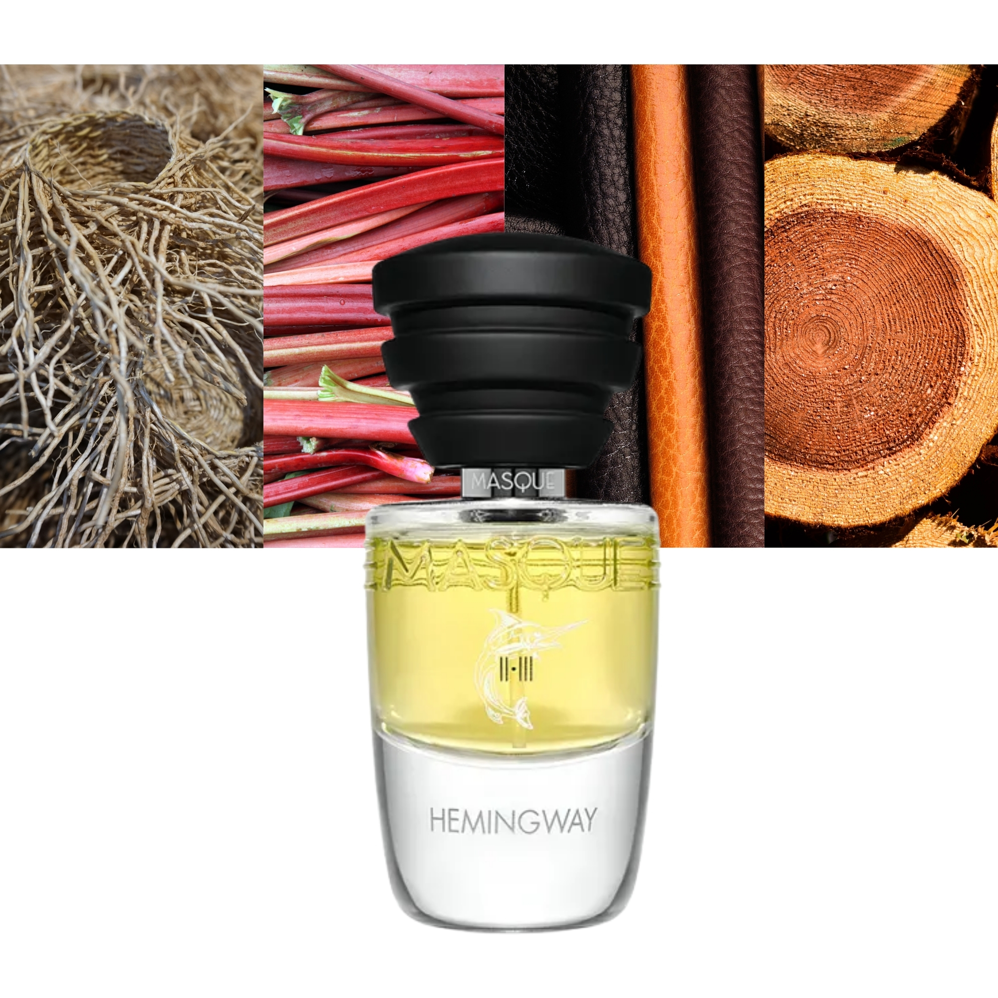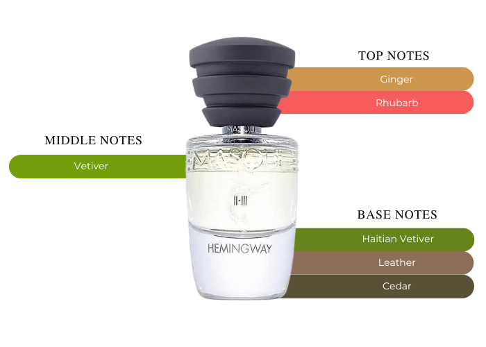Hemingway by Masque Milano is a Woody Spicy fragrance for women and men. Head Notes: Ginger oil fresh LMR, Rhubarb Heart Notes: Vetiver heart LMR Base Notes: Vetiver oil Haiti LMR, Vetiver oil Java Molecular Distillation LMR, Cedar wood oil, Patchouli oil Molecular Distillation LMR, Leather