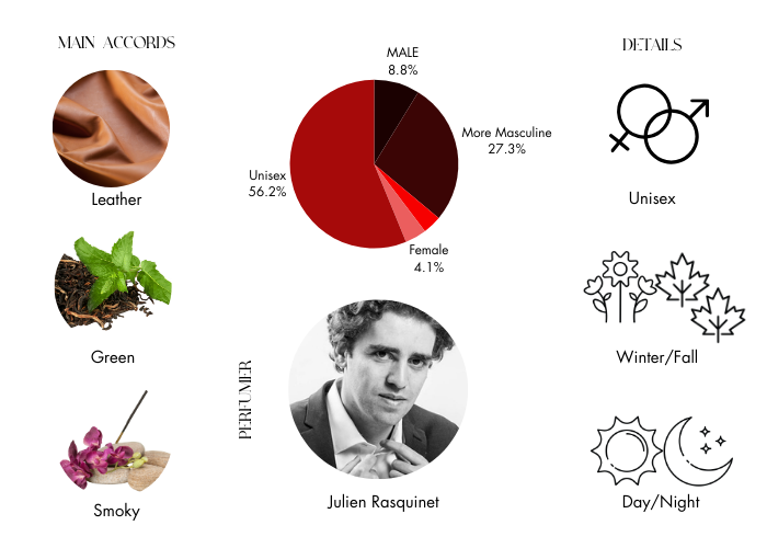 - Base Notes are Leather, Incense, Birchwood and Cistus-Labdanum.