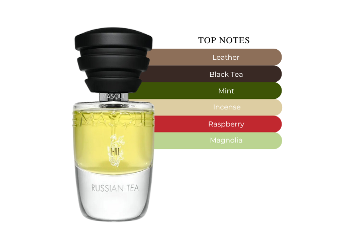 Russian Tea Masque Milano contains top notes of mint and black pepper along with raspberry, middle notes of black tea and Magnolia, and base notes of leather, incense, birchwood and labdanum.
