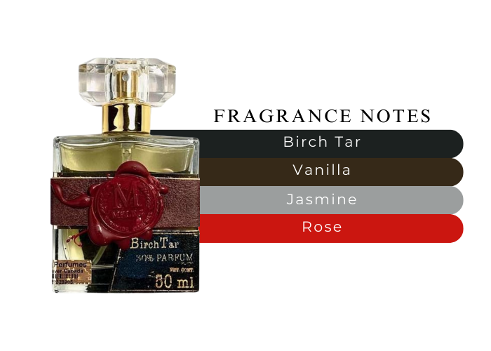 MIDDLE NOTES JASMINE ABSOLUTE (SOUTHERN INDIA) ROSE ABSOLUTE (MOROCCO) BASENOTES CASTOREUM (BEAVER MUSK) BIRCH TAR ABSOLUTE (CANADA) VANILLA BEAN TINCTURE (MADAGASCAR) VINTAGE MUSK KETONE (GERMANY)