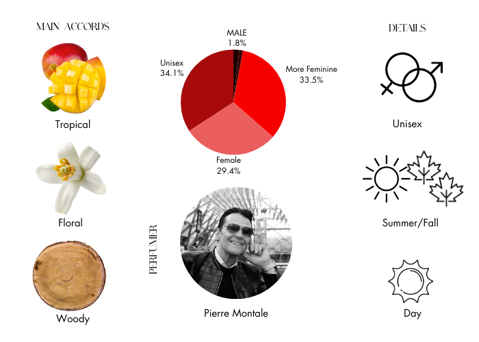 The blend opens like a refreshing tropical breeze, with top notes of mango and sweet orange zest. A flowery heart of Sambac jasmine, ylang-ylang, and neroli notes follows the breezy top closely. Finishing notes of Morrocan oud, vetiver, cedar wood, and oak moss create a solid base that beautifully balances out the zesty energy of the fruit and floral essence.