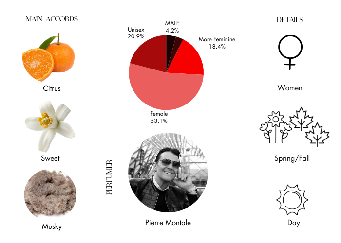 Fragrances notes are Orange Blossom, Neroli, Jasmine, Mandarin, Apricot, White Musk, Vanilla, and Patchouli.