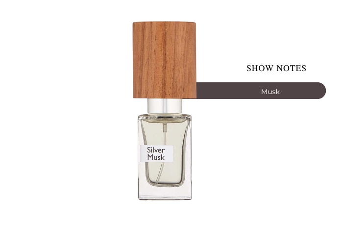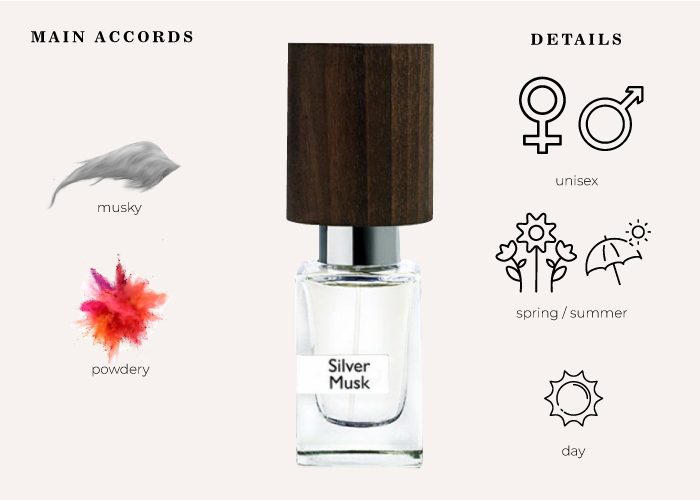 Nasomatto Silver Musk scent is light and fresh, containing notes of lemon and bergamot, a heart of white flowers, lily of the valley and neroli, with a base of musk.