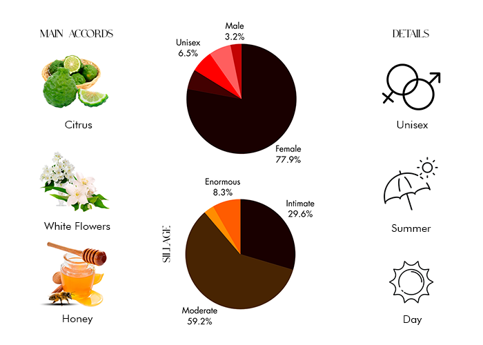 Immerse yourself in the luxurious notes of Bergamot, Galbanum, Carnation, Jasmine, Tuberose, Ylang-Ylang, Honey, Patchouli and Sandalwood, leaving a trail of sensuality in your wake.