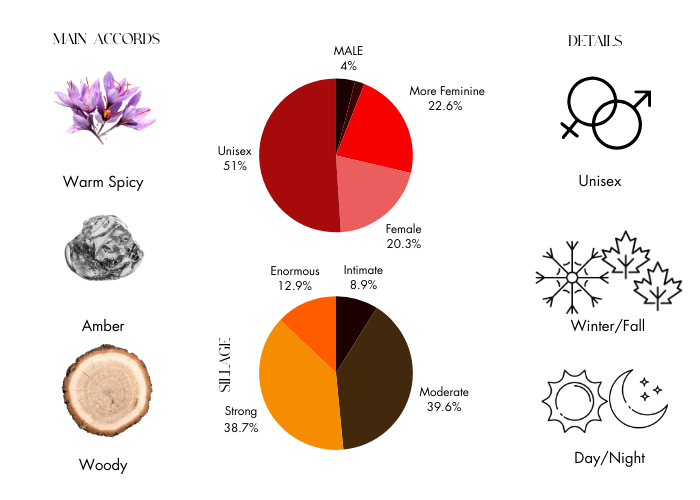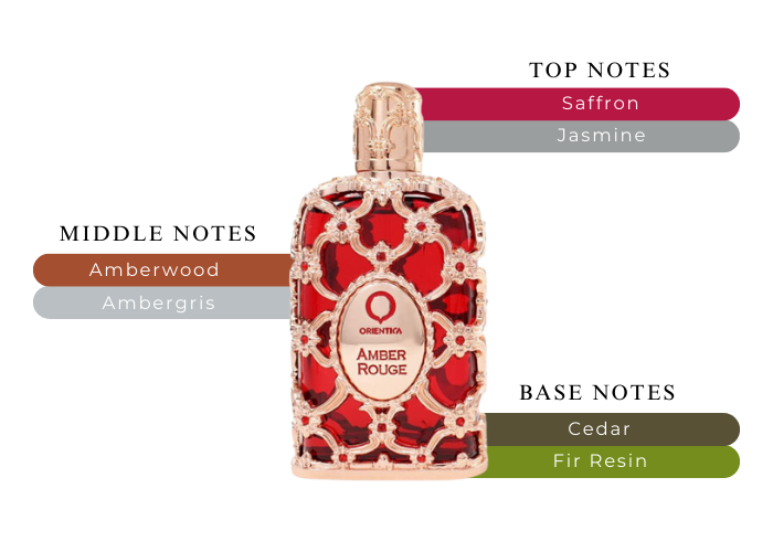 Top notes are Saffron and Jasmine; middle notes are Amberwood and Ambergris; base notes are Cedar and Fir Resin.