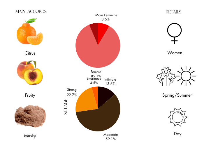 Top note: Orange blossom water, Bergamot, Mandarin Heart note: White peach, Fruity tea Base note: White rose, Musk, Tonka bean