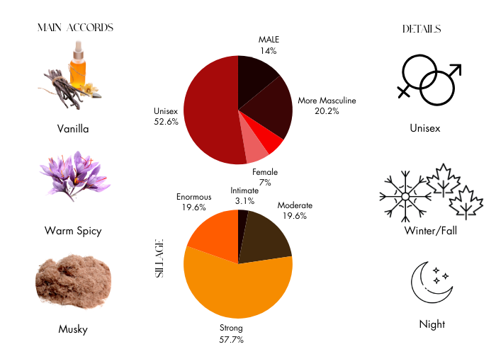 Top notes are Oriental notes and Vanilla; middle notes are Saffron and Patchouli; base notes are Musk, Guaiac Wood and Agarwood (Oud).