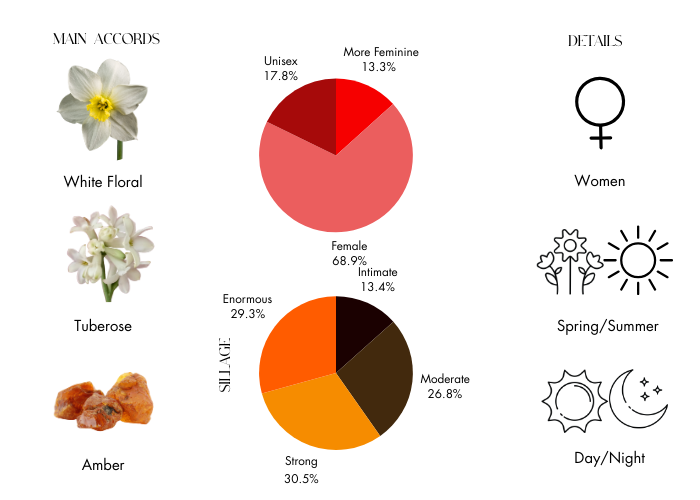 - Middle Notesare Tuberose, Narcissus and Frangipani.