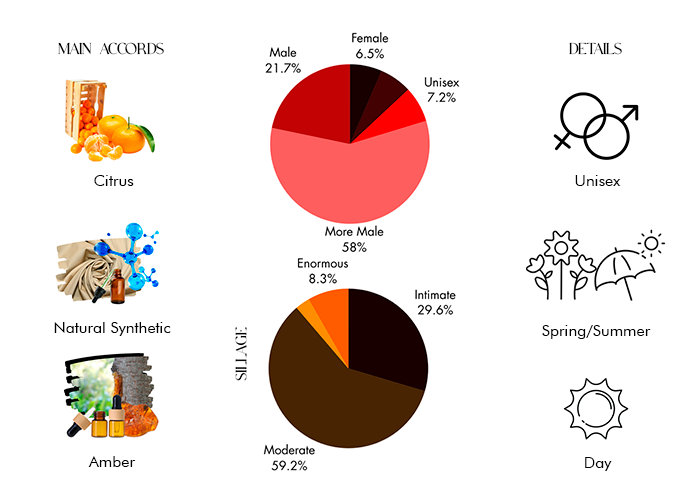 - Base notes are Oakmoss, Musk and Amberwood.