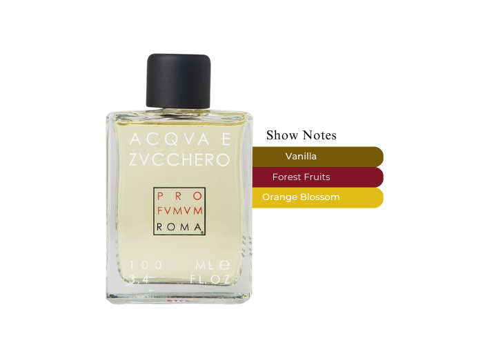Acqua e Zucchero by Profumum Roma is a Floral Fruity fragrance for women and men. Sensed her smoothness through touch. The dark of the room hid the shapes, her fragrance liquefied me and I felt drenched in honey. Enveloped by tender relaxation. Main Notes are: Orange flowers, Red fruits, Vanilla
