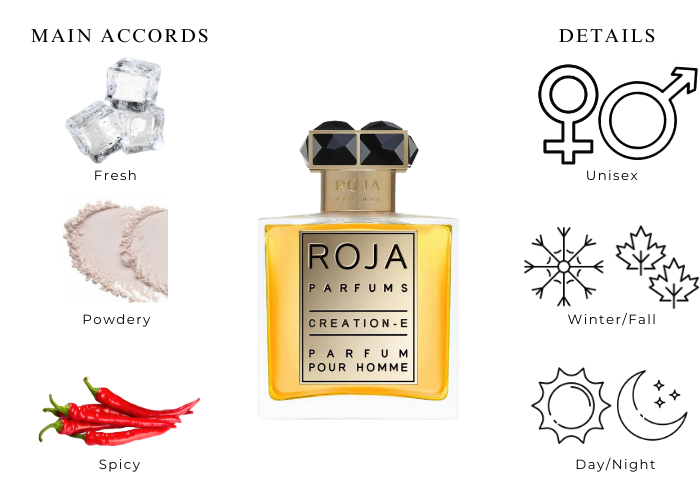Roja Parfums Creation E Parfum Pour Homme is an oriental fragrance. Enigma Pour Homme by Roja is fresh, spicy and warm. Shrouded in a swirl of Cognac and Tobacco, a suave figure sits cool and composed at the bar of a private members’ club - where the scent of Woods and Leather pervade. Warm touches of spice blend with soft Vanilla and Benzoin, which create a sense of ambiguity - nothing is quite what it seems.