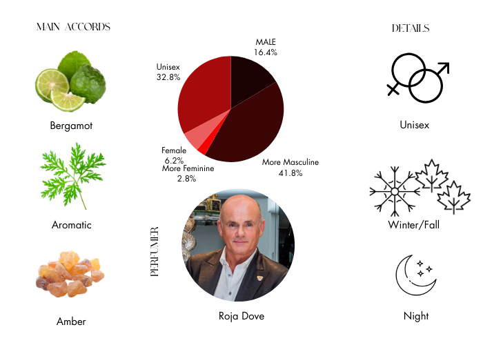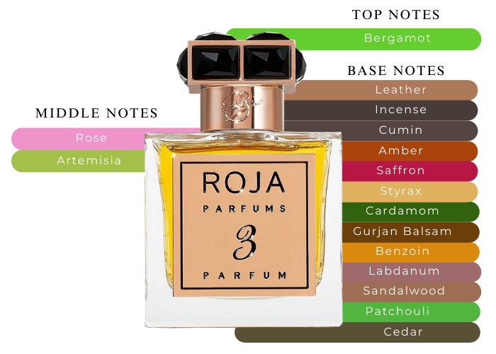 - Base Notes: Amyris, Cumin, Frankincense, Styrax, Labdanum, Leather, Saffron, Ambergris, Benzoin, Cardamom, Gaiac Wood, Gurjum Balsam, Juniper, Patchouli, Sandalwood, Cedarwood and Cypriol