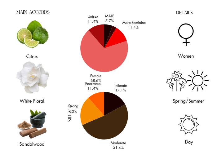 - Middle Notes: Lily of the Valley, Freesia, Rose de Mai, Gardenia, Orange Blossom, Jasmin de Grasse and Tuberose.