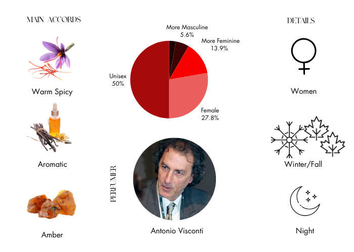 - Top Notes: coriander, marjoram, angelica, elemi, saffron