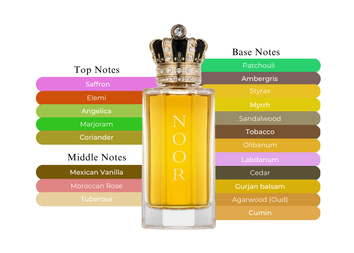 - Base Notes: ambergris, patchouli, agarwood (oud), sandalwood, myrrh, cedarwood, labdanum, gurjan balsam,styrax, tobacco