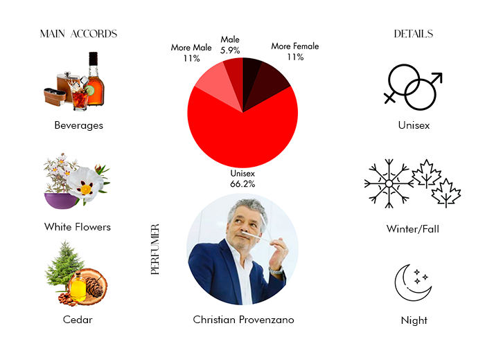 - Amber, Atlas Cedar, Bergamot, Damask Rose, Gaiac Wood, Labdanum, Musk, Oud, Patchouli, Rum, Saffron and Vanilla
