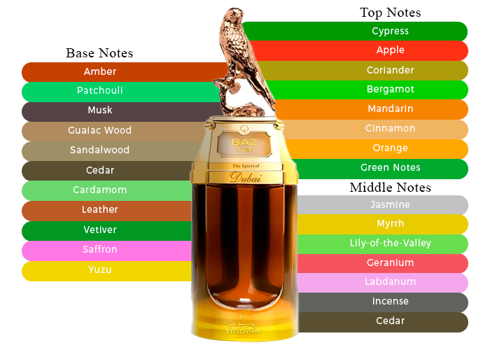 - Base Notes: Sandalwood, Leather, Musk, Amber, Safran, Gajak, Cardamom, Cedar Wood, Patchouli, Leather Notes and Vetiver