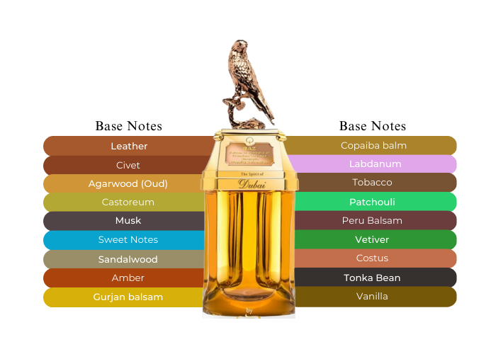• Base notes are Guaiac Wood, Sandalwood, Cistus, Tonka, Gurjum, Copaiba, Myrrhe, Patchouli, Peru Balsam, Civet, Costus, Vetiver, Praline, Amber, Vanilla, Musk, Castoreum, Labdanum and Indian Agarwood Oil.