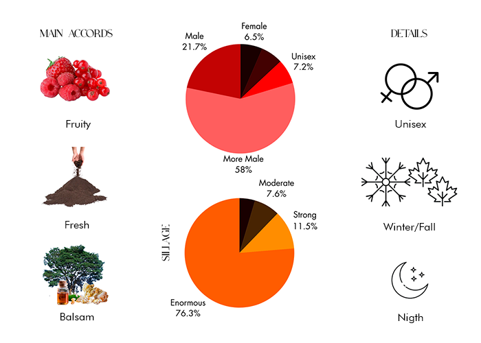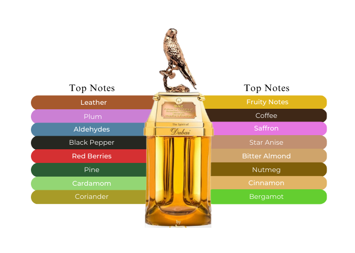 • Top notes are Falcon Leather, Cardamom, Coffee, Saffron, Coriander, Black Pepper, Aldehyde, Bergamot, Plum, Red Berries, Star Anis, Cinnamon, Nutmeg, Pepper, Clove and Mint.
