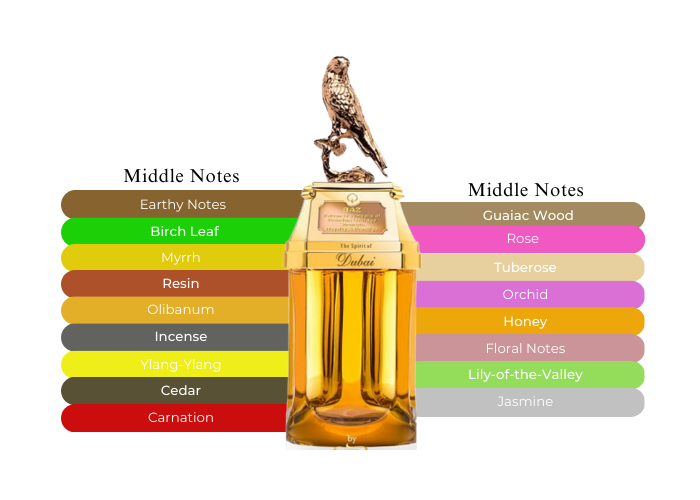 • Middle notes are Orchid, Carnation, Lily Of The Valley, Jasmine, Rose, Incense, Leather, Birch Leaves, Honey, Floral, Tuberose, Ylang-ylang, Geranium, Tobacco and Smoked Olibanum.