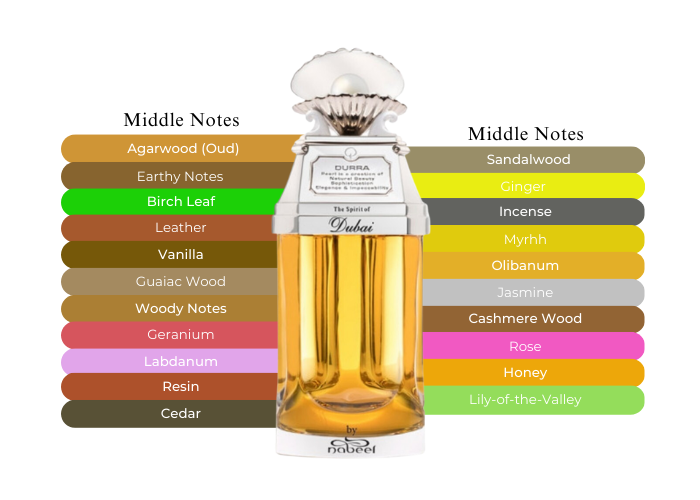 - MIDDLE NOTES are Geranium, Rose, Incense, Balsamic, Myrrh, Smoked Olibanum, Cedarwood, Earthy, Kharismal, Akigalawood, Jasmine, Birch Leaves, Honey, Muguet, Agarwood, Saffron, Vetiver, Cashmere, Sandal, Vanilla Berries, Iris, Fir, Lotus Flower, Cyclamen, Lavender and Orchid.