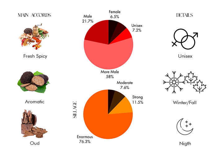 - Middle notes are Oudh, Orchid, Lily of The Valley, Corps Truffe, Amber, White Floral, Herbal, Green, Mossy, Rose Damascene, Jasmine, Iris and Ylang-Ylang.