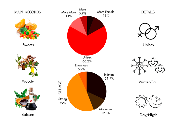 • Base notes are Patchouli, Sandalwood, Guaiac wood, Vetiver, Tolu Balsam, Peru Balsam, Leather, Smoky Notes, Cistus, Labdanum, Incense, Civet, White Musk, Ambergris, Vanilla, Mosses, Amber and Oakmoss.