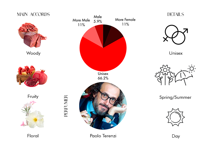 • Base Notes: Broom, Liquidambar, Sand, Vetiver, Arbutus, Cistus, Leathery Notes, Oleander, Patchouli and Salt