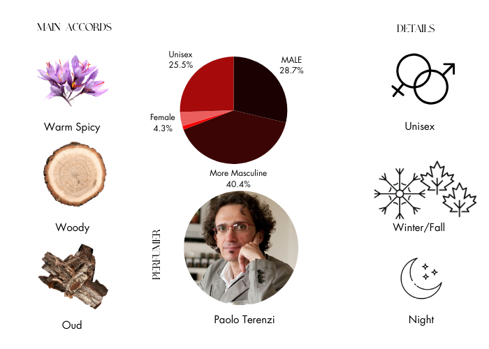 - Base notes are Amber, Patchouli, Sandalwood, Vanilla, Musk and Oud.