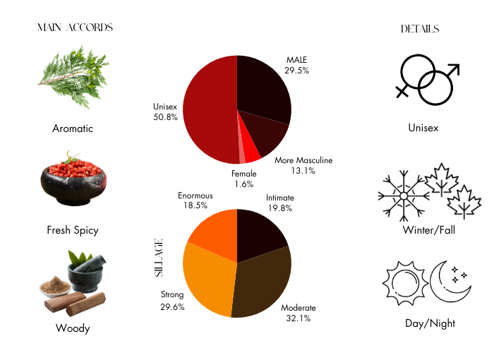- Top notes are Juniper Berries, Cypress and Aldehydes
