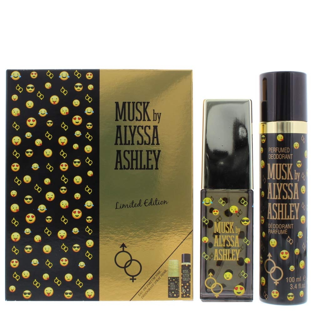 Contains: Eau De Parfum SPRAY 1.7 OZ + DEODORANT SPRAY 3.4 OZ This Emoji set contains a 1.7 ounce Eau de parfum spray and a 3.4 Oz deodorant spray. Alyssa Ashley Musk is a warm, sweet and sultry scent and is suitable for every occasion, day or night. Musk is classified as a gentle floral fragrance for women. This luxurious scent is ideal for evening wear. This is a heavenly deodorant spray that is infused with special ingredients that work hard to keep you feeling clean, without overpowering your senses. Ideal for casual wear to keep you dry all day long. TOP NOTES Blue amber, clove, jasmine MIDDLE NOTES Fresh rose BASE NOTES Orange blossom.