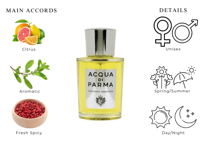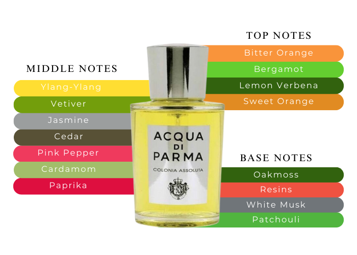 Top notes are bergamot, bitter orange, sweet orange and lemon verbena; middle notes are jasmine, vetiver, ylang-ylang, cedar, cardamom, pink pepper and paprika; base notes are patchouli, oakmoss, white musk and resins.