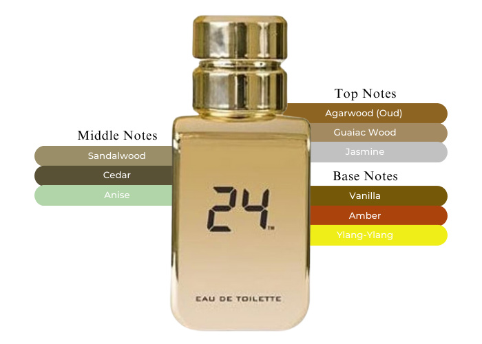 24 Gold Oud by Scentstory is an oriental woody fragrance. 24 fragrance Gold is woody vanilla and amber. Top notes are agarwood (oud), jasmine and guaiac wood; middle notes are sandalwood, cedar, and anise; base notes are vanilla, amber, and ylang-ylang.