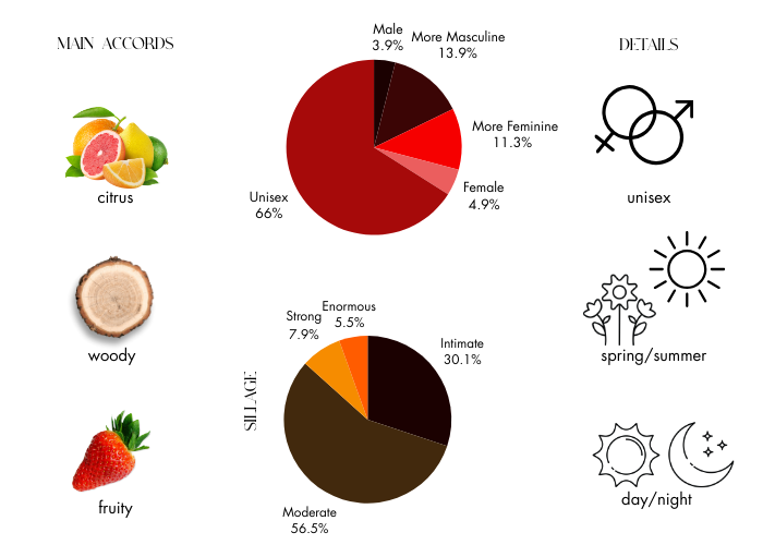 The top notes bring the Italian breeze from the Mediterranean, with fresh and sweet notes of bergamot, orange, luminous lemon, dazzling bitter grapefruit and mandarin wood. A heart is composed of fig, pink pepper, and jasmine, while a base is full of musk, cedar and fig milk.