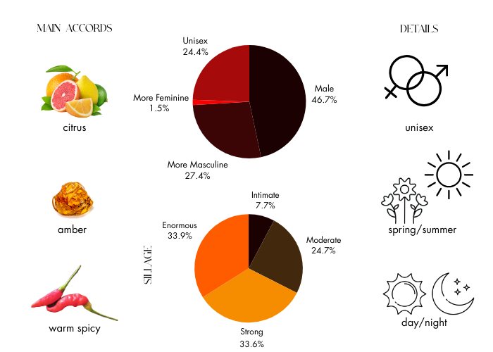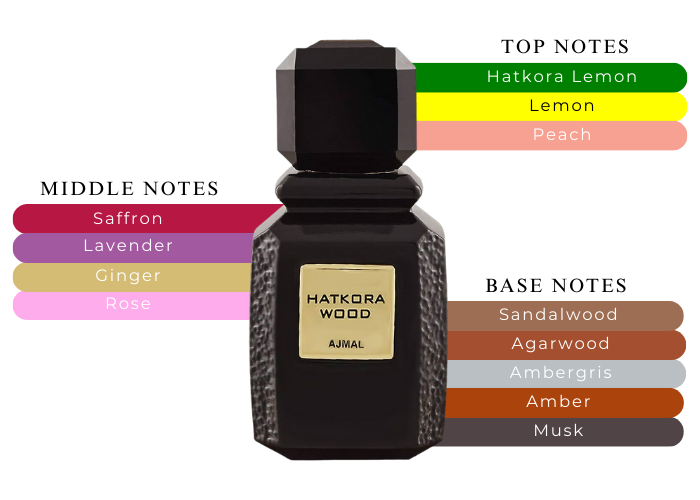 Fragrance notes are Hatkora lemon, Lemon, Peach, Ginger, Saffron, Lavender, Rose, Amber, Sandalwood, Oud, Musk, & Ambergris .