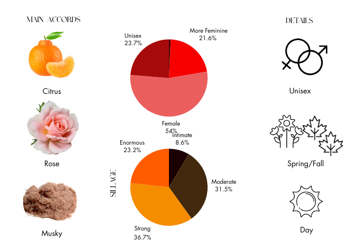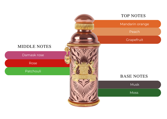 Fragrances notes are Mandarin orange, grapefruit, peach, iris, damask rose, violet, patchouli, musk, and moss.