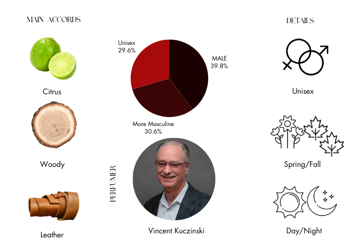 - Amber, Bergamot, Cedarwood, Cypress, Lemon Zest, Neroli, Suede, Tonka Bean and Vetiver