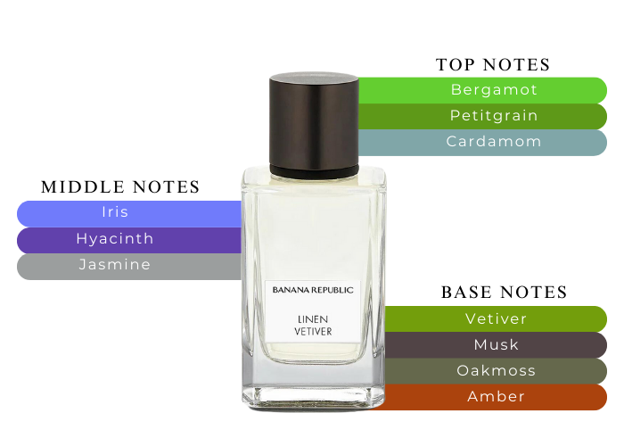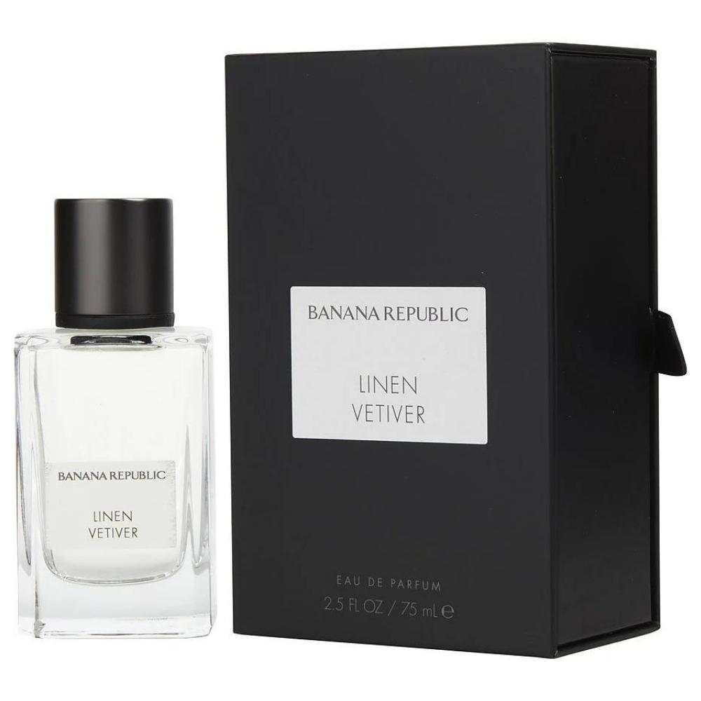This Banana Republic Linen Vetiver parfum from the Icon Collection has notes of green tea, bergamot, grapefruit, jasmine, African violet leaf, lavender, white vetiver, musk, amber. Order this Banana Republic fragrance from MaxAroma today!