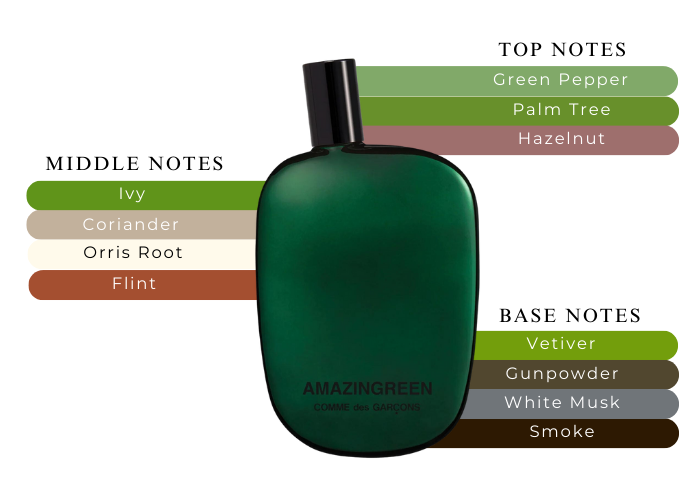Amazingreen by Comme des Garcons is a Aromatic Green fragrance for women and men. The nose behind this fragrance is Jean-Christophe Herault. Top notes are Green Accord, Green Pepper, Water Notes and Palm Tree; Middle notes are Ivy, Coriander and Orris Root; Base notes are Vetiver, gunpowder, White Musk and Incense.