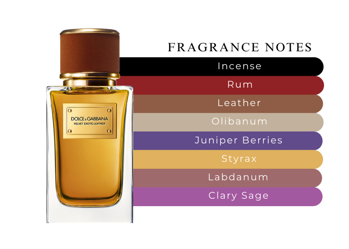"Velvet Exotic leather is a sensual and elegant scent, with a complex heart of Black Leather accord. Rich and warm Cistus Labdanum, intense Styrax and deep woody Cade oil create its unique and masculine leather character. Fresh notes of Clary Sage and Lavender and refined and fruity Rum absolute recall a vintage liquor. While Olibanum and Incense extend a warm and enveloping touch. "