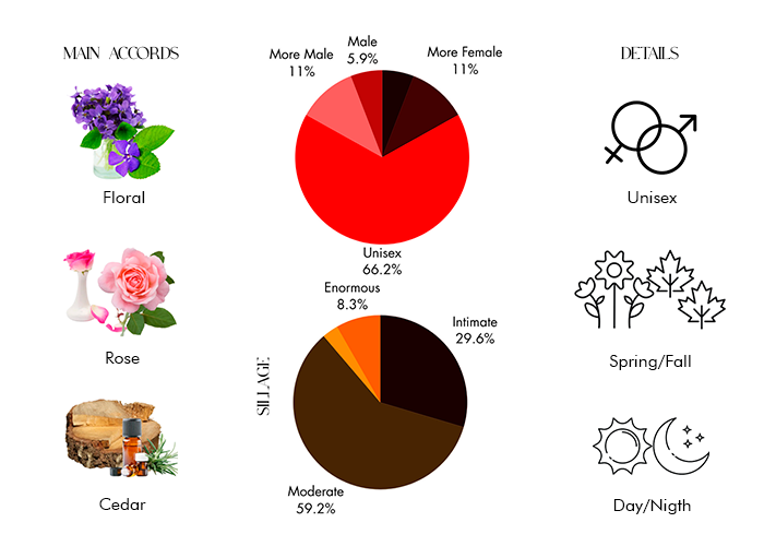 • French Violet, Pear, Jasmine, Almond. Rose, Freesia, Iris, Cedarwood, Musk and Vanilla