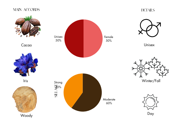 - Heart Notes: Iris, Orris Concrete and Chocolate