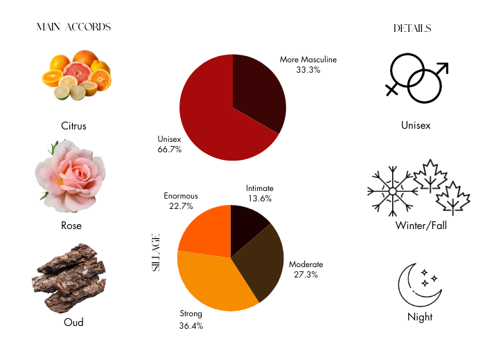 Korloff Rose Oud has a woody-floral scent, with a touch of citrus. This perfume is perfect for wearing during winter, as well as everyday wear. Korloffs perfumes contain high quality materials and have above average longevity, making them some of the best niche perfumes on the market today. Designed for women and men who enjoy woody-floral fragrances. The lasting power of Rose Oud Korloff is above-average so you can enjoy your favorite perfume throughout the day.