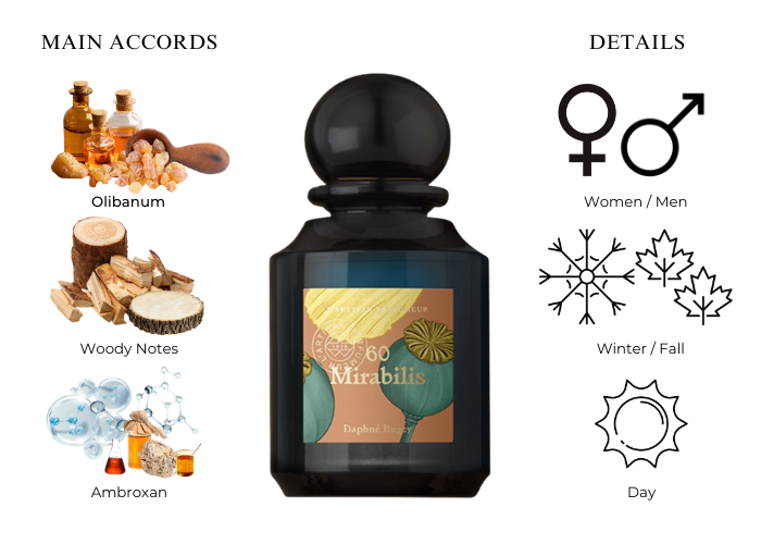 Start a conversation without saying a word. 60 Mirabilis by L’Artisan Parfumeur is the first woody fragrance targeted specifically to men and women, who are looking for a powdery-woody scent. It creates an instant connection wherever you go: walking in a crowd, sitting around a table full of friends, taking a long stroll alone through the rain.